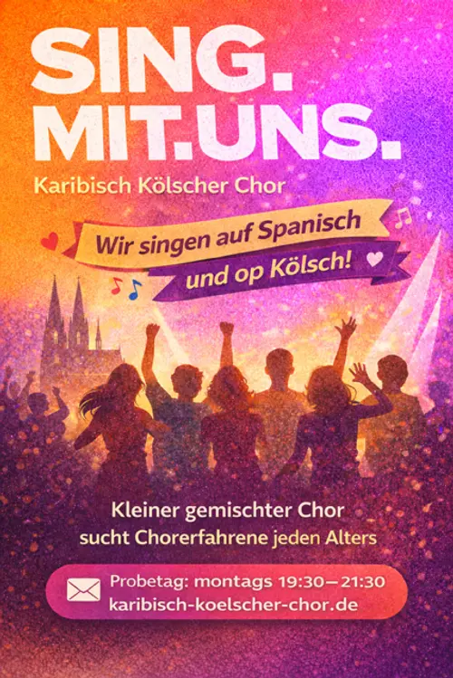 Karibisch Kölscher Chor Jeden Montag von 19:30 bis 21:30 UhrKostenlose TeilnahmeAnmeldung notwendig